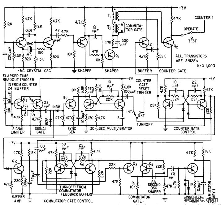 Used to trigger 24 elapsed-time counters until end of storage period, for storing and reading out elapsed time between consecutive but randomly occurring events. Gates are designed to maintain amplitude of trigger pulse above half the supply voltage over wide temperature range.-R. J. Kelso and J. C. Groce, Encoder Measures Random Event Time Intervals, Electronics, 32:12, p 48-51.