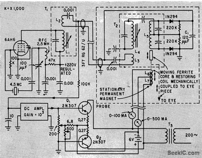 Moving ferrite core in probe deflects in proportion to eyeball pressure and produces signal that is amplified to drive recorder. Plateau of re corded response represents true pressure, which can easily be read independently of peak caused by extra pressure of probe.-R. S. Mackay and E. Marg, Electronic Tono-meter for Glaucoma Diagnosis, Electronics, 33:7, p 115-116.