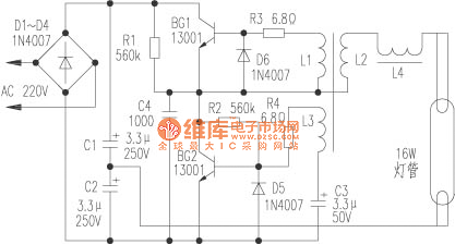 AC 220V rectified by the D1 ~ D4, C1, C2 filtering. C1 and C2 are series, can directly supply powertotubes to save charging capacitance, also reduced the compression requirements. R1 is startup resistance, provides BG2 forneeded initial voltage, R2 is bias resistors, BG1, BG2 and L1, L2, L3 compose theoscillating circuit, diodeD5 provides dischargecircuit for C3. L1 and L3 respectively connected to the bases of BG1 and BG2, which makes BG1 and BG2 get positive feedback voltageto initial. So that BG1 and BG2 turn in connected. High-frequency voltage formed in tubeto lighten it.