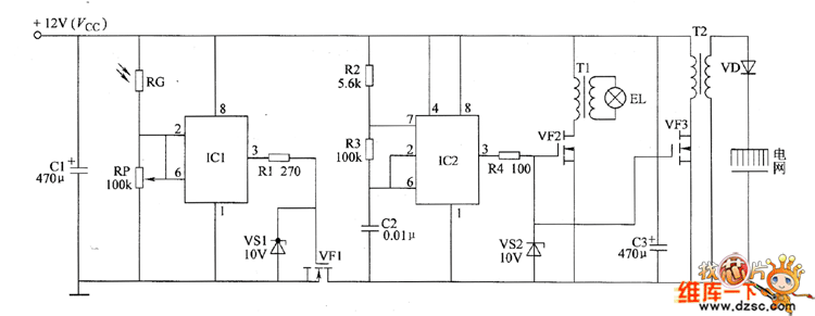 The electronic pests killing lamp circuit consists of the light control switch circuit, multivibrator, black light lamp drive circuit and high-voltage generator circuit, and the circuit is shown as the chart. Light control switch circuit consists of the photosensitive resistor RC, time-base integrated circuit IC1, potentiometer RP, resistor R1, Zener diode VS1 and field-effect transistor VF1. Multivibrator is composed of the time-base integrated circuit IC2, resistors R2, R3 and capacitor C2. Black light driver circuit consists of the resistor M, voltage regulator diode VS2, field-effect transistor YF2, pulse transformer T1 and black light EL. High-voltage generator circuit consists of the R4, VS2, and field-effect transistors VF3, high-voltage rectifier diode VD, and step-up transformer T2.