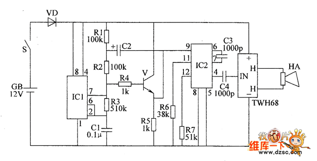 The electronic rodent repeller circuit is composed of the astable multivibrator, emitter follower converter, voltage controlled oscillator (YC0), driver amplifier circuit and the piezoelectric ceramic speaker HA with super loudness, and the circuit is shown as the chart. Astable multivibrator integrated circuit is composed of the time-base integrated circuit IC1, resistors R1 ~ R3, capacitor C1 and so on. Emitter follower converter is composed of the transistor V and the bias components. Voltage-controlled oscillator (VCO) consists of the PLL IC IC2 and external RC components. Driver amplifier uses TWH68 special amplifier module (including power amplifier circuit and ferrite step-up transformer, etc.). R1 ~ R7 select 1/4W carbon film or metal film resistors resistors.
