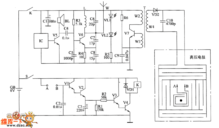 The electronic rodent repeller circuit is composed of the trigger control circuit, sound and light alarm circuit, wireless transmitter circuit and high-voltage generator output circuit, and the circuit is shown as the chart. Control circuit is composed of trigger sensor (the two electrodes between A and B ), transistors V1 ~ V4, resistors R1, R2, capacitors C2, C3, diode VD1 and relay K. Sound and light alarm circuit is composed of the music integrated circuit IC, transistor V5, speaker BL, resistor R5 and LEDs VL1, V12. Wireless transmitter circuit consists of resistors R3, R4, capacitors C4 ~ C8, inductor L, transistor V6 and antenna W. High-voltage generator output circuit consists of the resistor R6, capacitors C9, C1O, step-up transformer T, the transistor V7, diode VD2 and high-voltage electrodes.