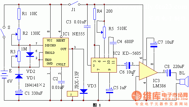 The working principleis shown in 1. It is composed of time control circuit, meow generation circuit, power amplifier circuit.etc. Time control circuit is composed of time-base circuit IC1 NE555 and Peripheral RC components, diodes and other components. It is a duty ratio adjustable pulse oscillator, the duty ratio is controlled by the R2 and R3. Meow circuit is a type of CMOS integrated circuit IC2 KD-5605, it uses storage technology to solidify meows in the interior of circuit. Power amplifier utilizes cheap and low-power audio amplifier integrated circuit IC3 LM386. Its features are few external components, wide voltage range, small distortion, simple assembly.