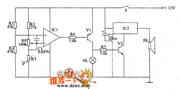 The frost alarm circuit is composed of the frost detection circuit and the sound and light alarm circuit, and it is shown in Figure 1. Frost detection circuit consists of the thermistor RT, resistors RI ~ R3, potentiometer RP, capacitor C1 and operational amplifier integrated circuit ICl. Sound and light alarm circuit consists of resistors R4, R5, transistors VI, Y2, alarm indicator HL, audio integrated circuit IC2 and speaker BL. R1 ~ R5 select the l/4W carbon film resistors or metal film resistors. RP uses the synthetic membranes variable resistor.