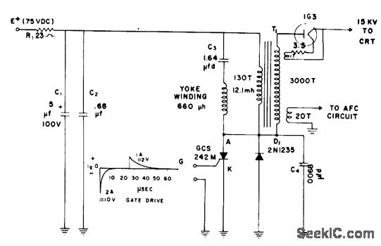 Uses gate-controlled switch GCS to replace horizontal output lube in television receiver, and semiconductor diode D1 to replace damper. GCS can cut off 2.5-amp peak current in 500 nsec.-J. W. Motto, Jr. GCS Sweep Circuit, EEE, 12:5, p 89-90.