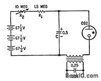 Supplies pulses that drive heart at desired rate. Output is connected to heart muscles by small wires. Frequency of relaxation oscillator is controlled, between 50, and 200 ppm, by R2.-L. D. Trump and R. L. Skinner, Simple Heart Pacer is Highly Reliable, Electronics, 32:39, p 92-93.