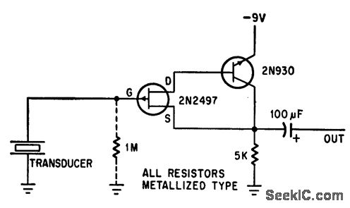 Fet eliminates unwanted noise and added capacitance caused by long cobias connecting hydrophone to shore station, Voltage gain is unity. Can be used with cables UP to 3.000 feel long. if hydrophone moves in water, use 1-meg resistor between gate and ground to suppress low-frequency excursions of signal,-F. Watlington, Hydrophone Preamplifier Cuts Cable Noise, Electronics, 39:16, p 120.