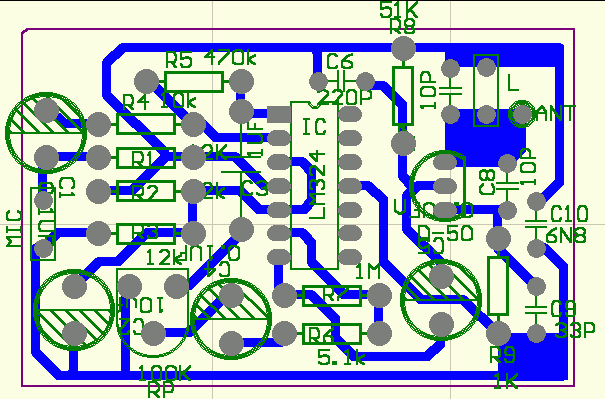The circuit is shown in the figure, it is composed of highly sensitive microphone amplifier and wireless transmitter unit, and the amplifier consisits of two op amps in quad op amp integrated circuit LM324. When the electret microphone MIC picks up weak sound signal, it will generate a signal voltage across the MIC, then the signal is amplified by pin 3 of the first stage operational amplifier after being coupled by capacitor C1, its amplification gain is more than 20 decibels, after the first-stage coupling, it is output from pin 1 and coupled by capacitor C3, then potentiometer RP control it for the second-stage amplifier by pin 5, then weak voice signal is amplified to have sufficient magnitude and sent to high - frequency transmitting circuit by coupling with C5.