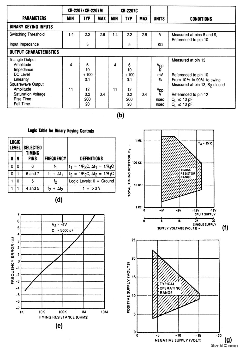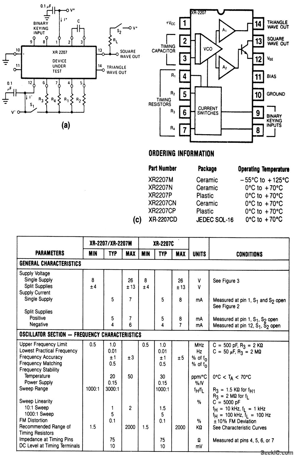 This circuit uses an XR-2207 to provide simultaneous triangle and square outputs (with binary keying if desired) over a frequency range of 0.01 Hz to 1 MHz, with a typical drift of 10 ppm/°C. The output can be linearly swept over a 1000:1 range with an external control voltage. Both the triangle and square output duty cycle can be varied from 0.1% to 99.9%. Electrical characteristics and functional circuits of the XR-2207 are shown in Figs. 5-36B and 5-36C, respectively. Operating frequency is set by capacitor C between pins 2 and 3, and timing resistors at pins 4-7. See Conditions in Fig. 5-36B.