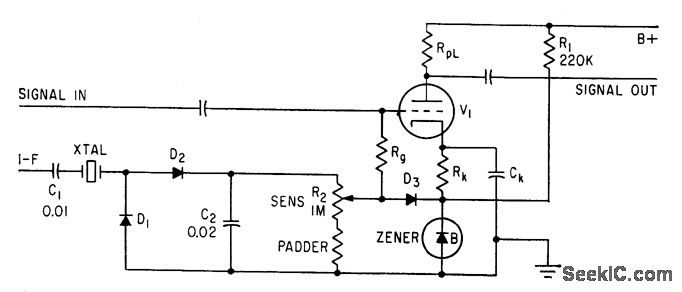 Applied to first audio tube of receiver. Tube is biased off by zener diode in cathode circuit, and keep alive current is supplied to zener from B+. Actuating codan, consisting of crystal, voltage-doubling rectifier, smoothing capacitor C2, and load, produces positive output only when signal is received from i-f. Crystal is at 1.1 center frequency. Audio is thus unblocked only when voltage of desired signal, as set by R2, is sufficient to overcome cutoff bias in cathode circuit.-R. L. Ives, Crystal Codans Give Accurate Receiver Tuning, Electronics, 33;22, p 113.