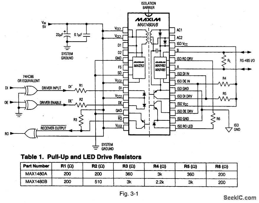 Figure 3-1 shows the typical application circuit for the MAX1480A/B. These ICs are complete, electrically isolated RS-485/RS-422 data-communications interfaces. Transceivers, opto-couplers, and a transformer provide a complete interface in one 28-pin package. Figure 3-2 shows the pin descriptions. Figures 3-3 and 3-4 show the function tables. The MAX1408B has reduced-slew-rate drivers that minimize EMI (electromagnetic interference) and reduce reflections caused by improperly terminated cables, allowing error-free data transitions at data rates up to 250 kbps. The MAX1480 driver slew rate is not limited, allowing transmission rates up to 2.5 Mbps. The ICs draw 28 mA of quiescent current. The MAX1408B provides a low-power shutdown mode that consumes only 0.2μA. The drivers are short-circuit current-limited and are protected against excessive power dissipation by thermal shutdown circuits that place the driver outputs into a high-impedance state. The receiver input has a fail-safe feature that guarantees a logic-high output if the input is open circuit. The ICs typically can withstand 1600 Vrms for one minute or 2000 Vrms for one second. MAXIM NEW RELEASES DATA BOOK, 1995, P. 2-13, 2-15, 2-17