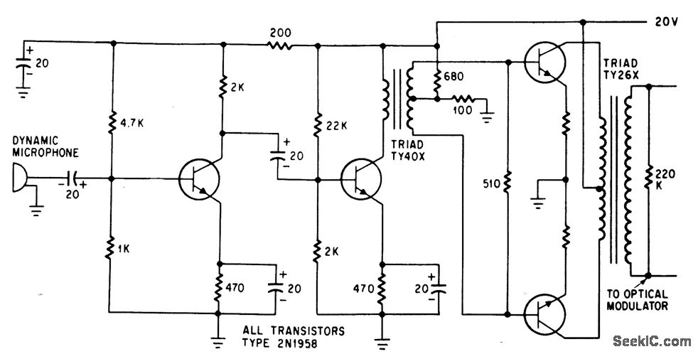 Audio driver delivers 300 v peak. to peak to KDP optical modulator controlling gas laser.-C. J. Peters et al., Laser-Television System Developed With Off-The Shelf Equipment, Electronics, 38:3, p 75-78.