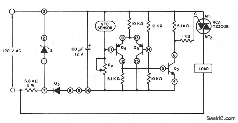 This circuit uses a CA3096 or CA3096A transistor array to control a triac.