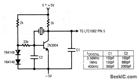 This circuit shows a crystal oscillator that is designed as a clock for an LTC1062 filter (chapter 7). The clock frequency is determined by the crystal and the values of C1 and C2, as shown by the table. Linear Technology Corporations Linear Applications Handbook, 1990, p. AN20-12.