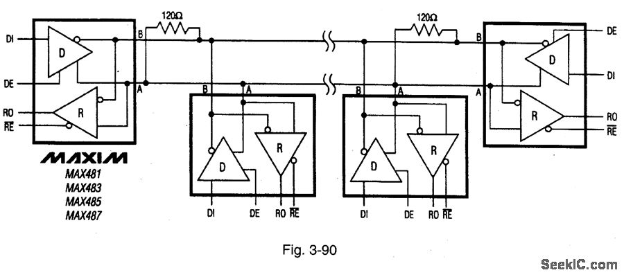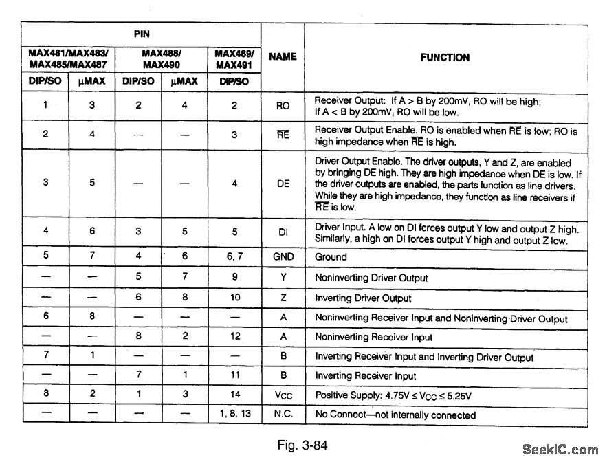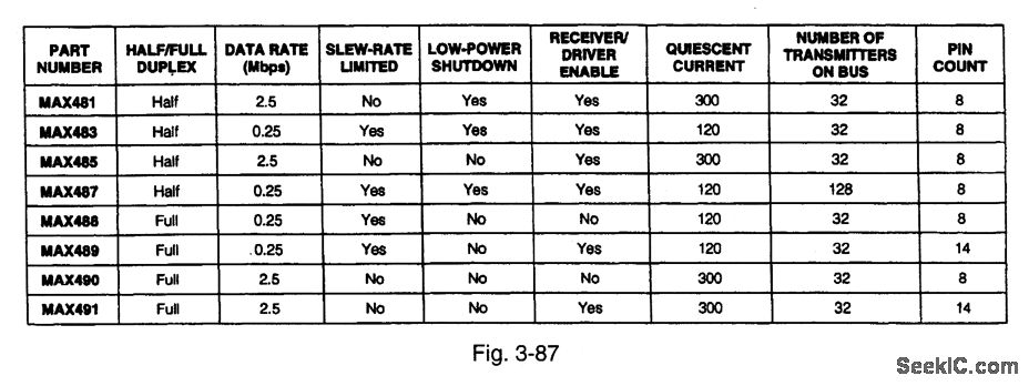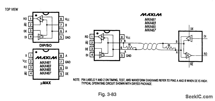 Figure 3-83 shows the typical application circuit and pin configurations for the MAX481/83/85/87. Figures 3-84, 3-85, and 3-86 show the pin functions. Figure 3-87 is the selection table. Figures 3-88 and 3-89 show typical application circuits and pin configurations for the MAX488 through MAX491. Figure 3-90 shows the 1NlAX481/83/85/87 in a typical RS-485 network. Figure 3-91 shows the MAX488 through MAX491 connected in a full-duplex RS485 network. Figure 3-92 shows the MAX488 through MAX491 connected as a line repeater. MAXIM NEW RELEASE DATA BOOK, 1995, P. 2-t59, 2-165, 2-166, 2-167, 2-168, 2-171, 2-172.