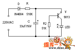 It uses the charging and discharging characteristic of capacitor C and the negative resistance characteristic of triode V under the breakdown condition to constitute a squegger oscillator. After getting power, 220V alternating current is half-wave rectified by diode D, current limited by resistor R to charge for C. When C's both sides voltage rises to V's breakdown voltage ( the actual value is approximately 9V), then it rapidly discharges by V to make the LED connected in discharging loop illuminate. After the discharging ended, V regains the closure condition, C starts to charge and to be redundant the above process. V has the synchronized signal which added to base to trigger the avalanche. Electric circuit working actual value is only 0.17mA.