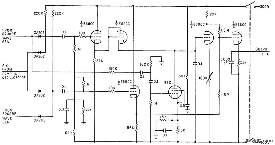 Circuit subtracts one sampled waveform from the next, to reduce noise disturbances by factor of 10 in equipment using strip transmission line for determining polarity reversal time of thin magnetic films to be used as switching elements in computers.-W. Dietrich and W. E. Proebster, Measuring Switching Speed of Magnetic Films, Electronics, 33:23, p 79-81.