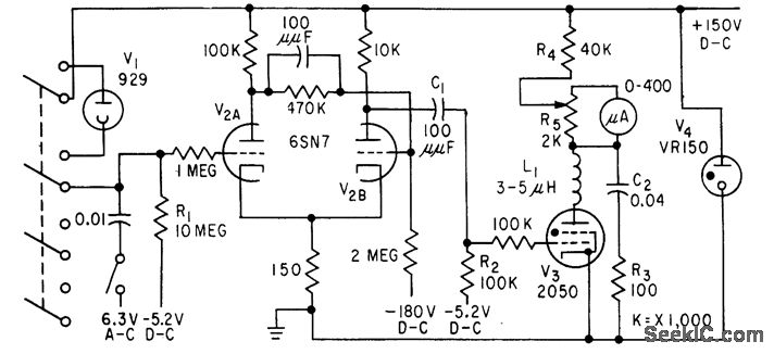 Gives exact frame rate at each instant. Lens is removed for test. Light beam is projected into camera, and reflected back from pressure plate in film gate each time shutter opens. Reflected beam is deflected into phototube that feeds Schmitt trigger. Differentiated output goes to thyratron in circuit of meter that reads frame rates directly from 5 to 64 frames per second. May also be used for checking projectors.-C. Owlett, FrameRate Checker for Motion-Picture Cameras, Electronics, 31 :37, p 88-89.