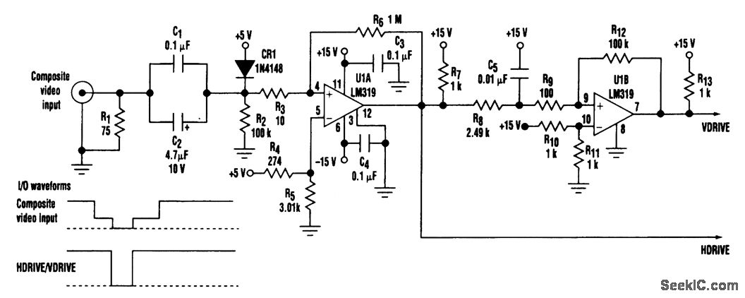 This dual-comparator, multirate video sync stripper provides separate horizontal and vertical pulses that are consistent with the composite video-input-signal sync pulses. Using an LM319 dual-comparator integrated circuit and associated passive components, this circuit can strip horizontal (HSYNC) and vertical (VSYNC) sync pulses from standard RS170 video (525/2:1 interlaced) through an industry high-end video rate of 1280 X 1024/1:1 (noninterlaced). The composite video input signal is ac-coupled through capacitors C1 and C2 to the junction of resistors R2 and R3 and diode CR1. The video sync tips are clamped by CR1 at approximately 4.5 V and applied to noninverting input of comparator U1A (pin 4). Positive feedback from resistors R6 and R3 provides a hysteresis of about l50μV to ensure a stable state change at the output of U1A (pin 12). R8 and C5 constitute a low-pass filter that prevents the filtered amplitude of the horizontal sync pulse from dropping below the threshold volt-age of 7.5 V, established by R10 and R11 for the inverting input of U1B (pin 10). R9 and R12 supply a hysteresis of about 15 mV to the noninverting input of U1B (pin 9). The inherently longer vertical sync pulse width provides sufficient time for U1A (pin l2) to be near ground. As a result C5 is adequately charged Lo exceed the threshold voltage and generate a vertical (VDRIVE) at U1B (pin 7).