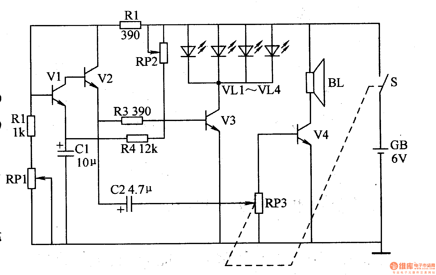 Oscillator circuit consists of transistors Vl, V2 and related peripheral components. LED driver circuit consists of the transistor V3 and LED VLl-VL4. Audio circuit consists of transistor V4, coupling capacitor C2, and speaker BL, volume potentiometer RW. Turning the power switch S, the oscillator circuit oscillates, the emitter of V2 outputs oscillation signal. The oscillation signal is amplified by V3 to drive VLl-VL4 shining; another path is amplified by V4 to drive speaker BL toissue the sound of dripping water. Adjusting potentiometer RP2, RPl can change the oscillator frequency, thus changing the speed of sound dripping and LED flash frequency.