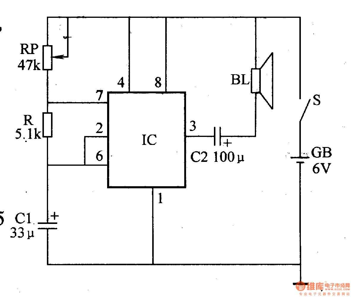 After turning on power switch S, +6 V voltage is applied to 4 feet and 8 feet of IC to provide power supply for the IC. After multivibrator oscillation, the pin 3 of IC outputs low-frequency oscillation pulse signal, and it is combined by the capacitor C2 and added to the speaker BL, then it issues the simulated sound of dripping water. The voice has hypnotic effects for insomnia. Adjusting potentiometer RP can change capacitor Cl and the operating frequency of multivibrator. The selection of componentsR selects 1/4W carbon film resistor. RP uses small solid potentiometer or sealed variable resistor. Cl and C2 select the electrolytic capacitor with voltage in lOV. IC uses NE555 or μA555, LM555, 5G1555, FX555 and other models of time-base integrated circuits.