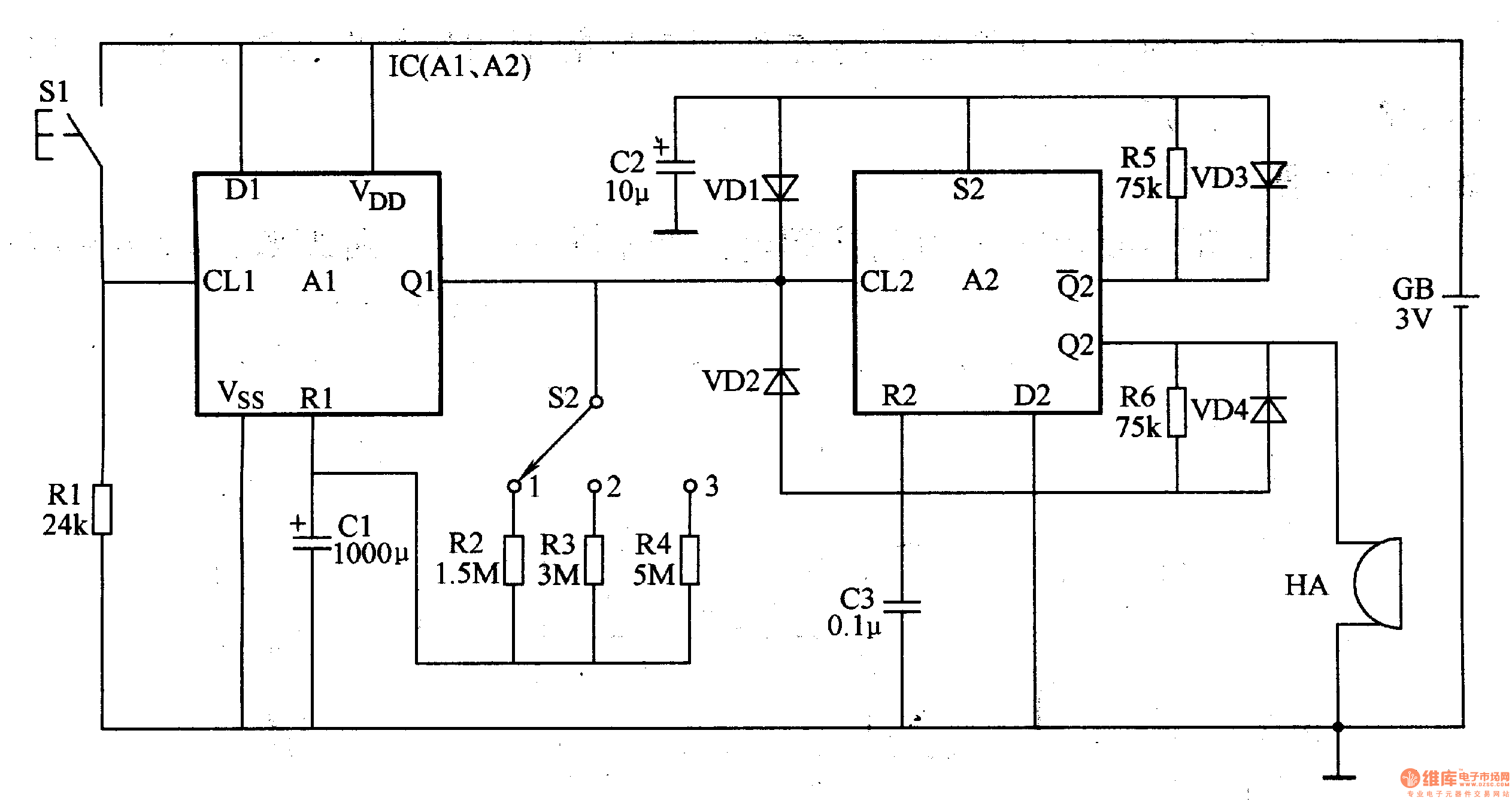 Monostable circuit is composed of dual D flip-flop integrated circuit IC (Al, A2) and resistors Rl-R4, capacitor Cl, control button 51 and delay time selection switch 52. Self-excited multivibrator circuit is composed of the other D flip-flop A2 inside the IC and diodes VDl-VD4, resistors R5, R6, capacitors C2, C3. Pressing button S1, the flip is triggered by the monostable circuit, IC's Ql outputs high level, the multi-harmonic oscillator works, the Q2 of IC outputs 2Hz oscillation frequency signal, the driver HA issues a similar sound of raindrops to help people sleep. When the charging of Cl is over, one-shot circuit returns to steady state, IC's Ql outputs low level again, multi-harmonic oscillator stops working, HA stops the sound.