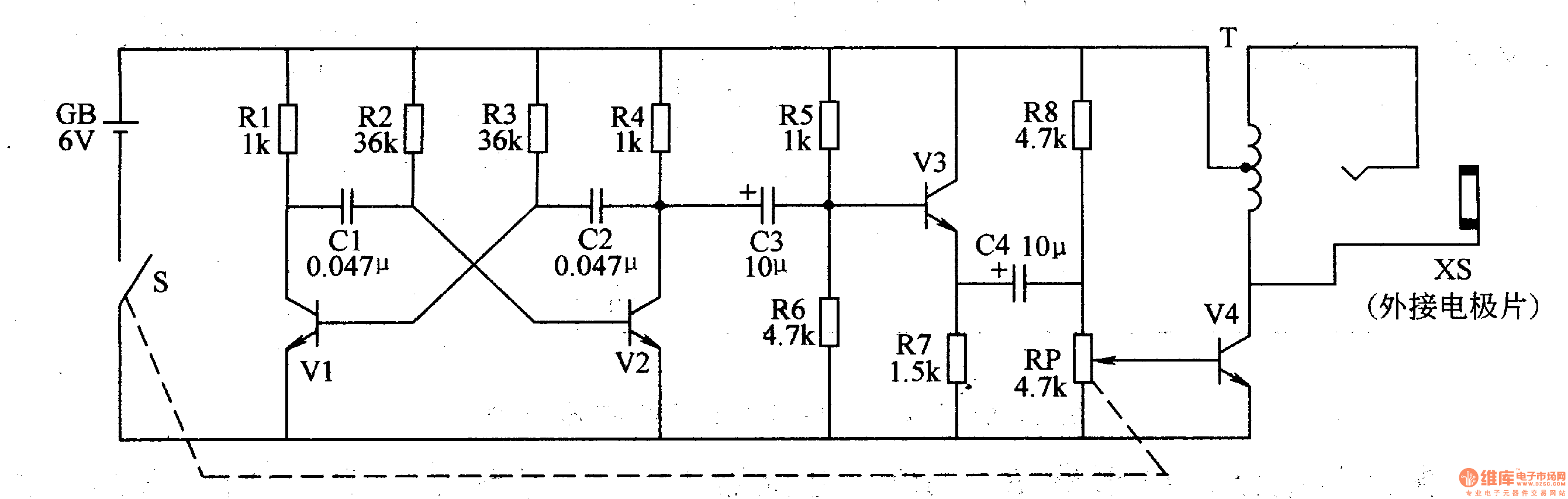 Self-excited multivibrator is composed of the transistor Vl, V2, capacitors Cl, C2 and resistors Rl-R4 and so on. Buffer amplifier circuit is composed of the emitter amplification tube V3, bias resistor R6 and geese coupling capacitors C3, C4. High-voltage generating circuit is composed of the potentiometer RP, resistors R8, amplified output tube V4, the garnet-type step-up transformer T and output socket XS. Self-excited multivibrator can generate the oscillation signal with frequency in 5OOHz, and it is amplified by the V3, V4 and transformer T, the outlet XS outputs pulse voltage which is more than lOOV.