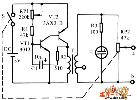Physical therapy device circuit diagram is shown as the chart. The complementary type square-wave generator is composed of transistor VT1, VT2, and space multiplier is boosted by transformer T, then output by at a and b ports by BP2. H stands for NH - 416 type neon bulb. When the circuitry works, it will shine, indicate working status. RP1 is a type of frequency adjust potentiometer which can adjust the oscillation frequency, and we can see it from the shine of H. RP2 is a type of output strength adjust potentiometer(with switch). T could use output transformer in common transistor radios, the original 8 Ω terminal connects connentor VT2. VT1 requires that β≥100, and VT2 requires β≥50.