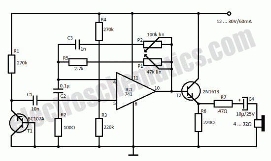 Insomnia treatment consist mostly of sleeping pills consumption but this circuit is an alternative for that and consists of a simple circuit that generates a rain sound effect. The japanese researches were the first to discover that sound of rain has a relaxing effect. With the help of this simple circuit we can generate the rain sound which can be a sleep aid in case of insomnia.T1 is used as a noise generator and its signal is amplified by the 741 IC and thru T2, R7 and C4 goes to a headset with low resistance. If you do not want to use the headphones then use a speaker with impedance between 4 and 16 Ω. With the help of P1 can adjust sound level and with P2 the tone.