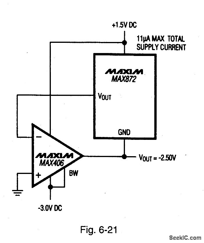 Figure 6-21 shows a MAX406 combined with a low-dropout MAX872 to form a precise -2.5-V reference that requires no external components. Typically, the MAX872 requires two external resistors. Maximum current drain is 11 μA. There is no degradation of voltage because of load regulation and no compensation is needed for load capacitance. The supplies need not have precise regulation. The positive supply can be as low as 1.1 V with the negative supply as low as 2.7 V. MAXIM NEW RELEASES DATA BOOK, 1994, P. 3-31.