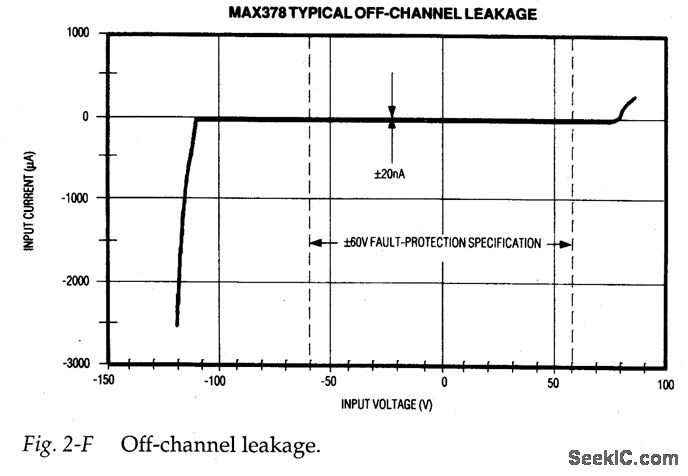 Figure 2-E is a test circuit for measuring off-channel input voltage versus the resulting input-leakage current. Figure 2-F shows typical test results. As shown, the input leakage during fault conditions is less than 20nA. The voltmeter at the out-put shows the effect of off-channel leakage on the selected channel. The effect with 100-kΩ, input resistors (less than 0.1 mV) is hardly noticeable.VOUT is limited by internal clamps to about 3 V less than the supply rails, and ranges between ±12 V with ±15-V supplies. VOUT collapses to 0 V when the power is off.