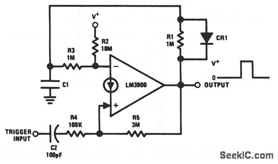 This circuit uses one LM3900 Norton amplifier to provide a positive one-shot output pulse. CR1 (a 1N914 or equivalent) permits rapid re-triggering. National Semiconductor, Linear Applications Handbook, 1991, p. 242.