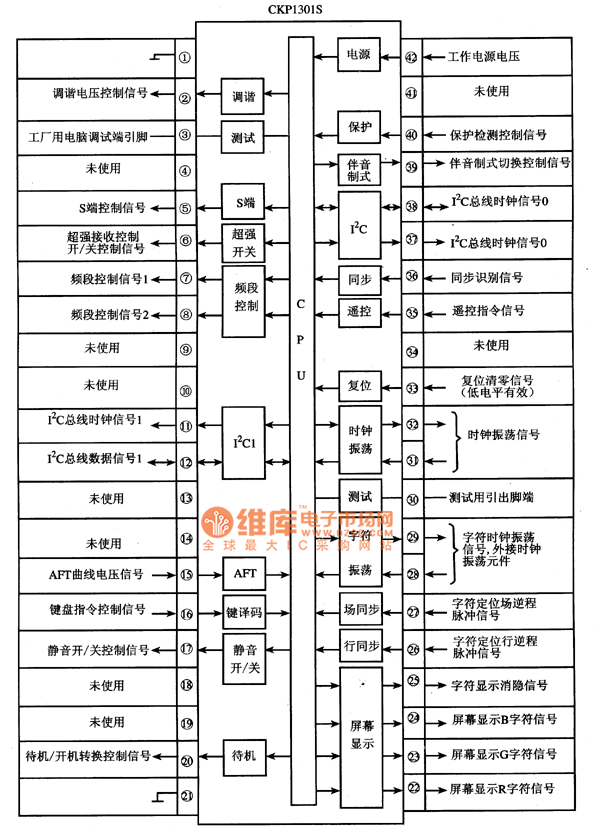 The CKP1301S IC's internal part is mainly made up of central processing unit (CPU), clock oscillation circuit (main clock, screen display oscillation clock), reset control circuit, I2C bus control circuit, key command signal decoding circuit, remote-control command signal processing circuit, screen display character generating and processing circuit, standby/starting control circuit, testing circuit, sound system switch circuit and other some control and auxiliary function circuits and so on. Its internal circuit diagram and pin's function and signal flowing is shown in picture 1.