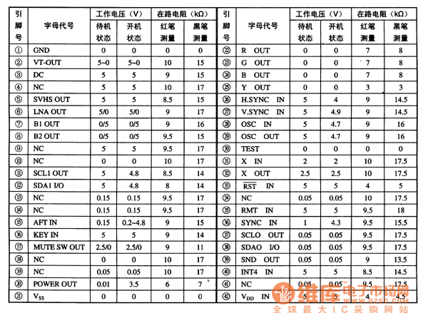 The CKP1301S IC uses 42-pin dual package. Its pin's function is shown in picture 1 and its pin's letter code and data is listed in table 1.
