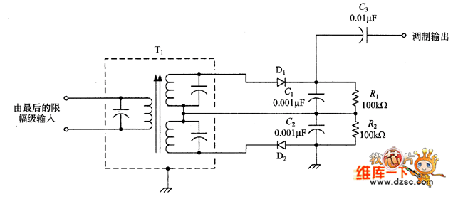 A classic FM frequency detector circuit is shown in the picture. The circuit uses a special transformer which has two secondary windings. The two secondary windings are separately connected to the two sides of the IF frequency which have the same distance to IF frequency and are not fay from the IF frequency. The two frequency's distance should be a little bigger than the transmitter's amplitude. The output would combine through a couple differencial signal diodes (D1 and D2). The diodes' output ports are connected to the load resistor R1 and R2. Generally, when the signal has not been modulated, the algebraic sum of the two diodes' output is zero. That would make the output be zero.