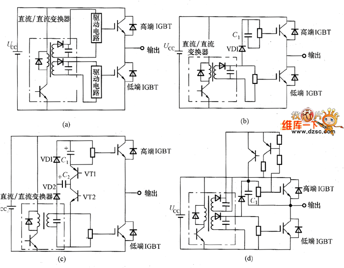The ICBT grid driving circuit itself is using the hybrid method. Its internal optocoupler type, high-voltage type IC would make it small. But the control power, which provide power for the grid electrode driving circuit, should use the transformer and smoothing capacitor and so on. For the driving circuit overall miniaturization, it should consider the miniaturization of these elements. So it would take different ways for the control circuit, which are shown in the picture. The picture (a) is transformer method. It is a stable power of which the high and low side IGBT can get the same voltage. The picture (b) is the bootstrap method. The C1 is the bootstrap capacitance. The VD1 should select the high-voltage diode. The inverter's output duty cycle shouldn't be 100%.
