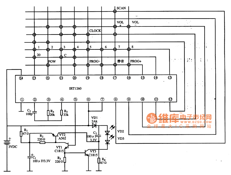 The infrared remote-control transmitter typical application circuit composed of IRT1260 is shown in the picture.