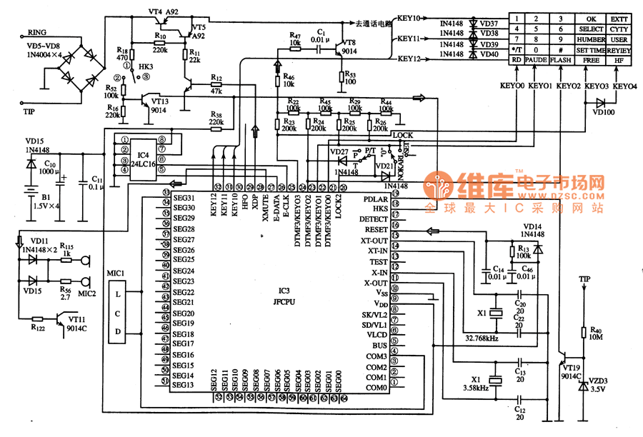 The JFCPU IC's internal part is mainly made up of clock oscillation circuit, double-tone dialing circuit, E2PROM memory, key bit pulse generating circuit, key command coding circuit, reset control circuit, starting control circuit, LCD display decoding driving circuit and so on.
