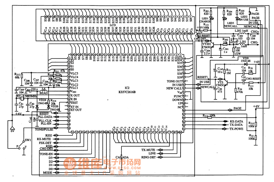 The KS57C2616B IC's internal part is made up of CPU which is used to control many kinds of commmand signals' input and output, FSK decoding circuit, many kinds of command signals receiving and detecting circuit and resending circuit, and signal path selection circuit, system clock oscillation circuit, transmitting and receiving static double tone/pulse dialing selecting circuit, ring signal detection circuit, indicator light control, LCD liquid crystal display decoder driving circuit and so on.