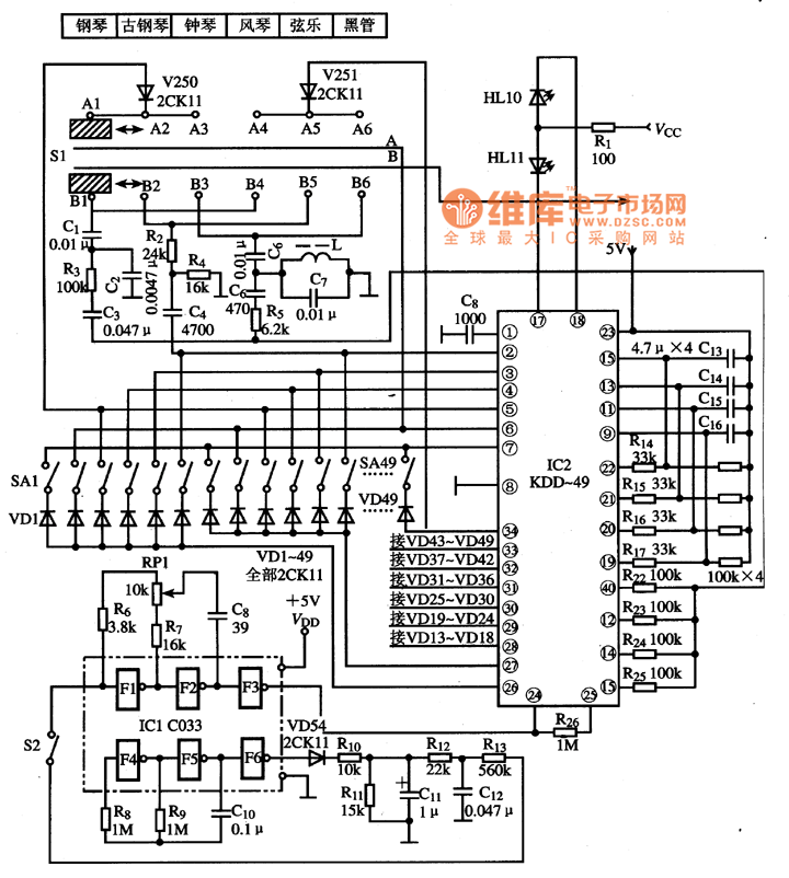 The KDD49 IC's internal part is made up by oscillator frequency control circuit, switching matrix circuit, envelop control circuit, music signal processing circuit, displaying driver control circuit and some other secondary function circuits.
