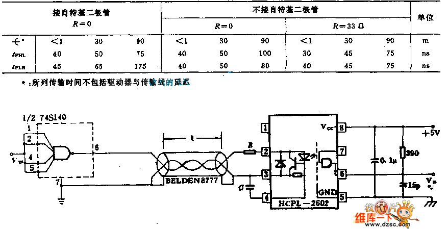 The 74S140 driver with the same polarity, through the shielded cable, twisted-paircable or coaxial cable, transmits data to the HCPL-2602 optocoupler wide receiver in a high speed data transmission. The reflex action caused by active-ended receiver would not affect its performance. By connecting to a capacitor C and a resistance R in series could make its data transmission speed up to highest possible speed. The C should be as large as possible, and do not prevent the voltage regulator tube's shutoff during input signal negative bias. If try to let tPHL=tPLH, that can achieve the highest data transmission speed.