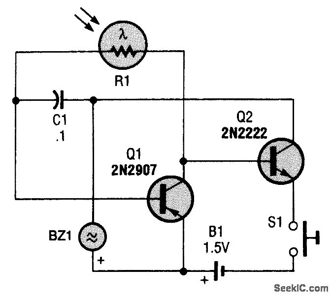 This circuit is little more than a simple two-transistor oscillator (a relaxation type) whose frequency is controlled by a light-dependent resistor (LDR). The oscillator can be built using nearly any NPN and PNP transistor combination desired, and its operation is simple, as its parts count is low. The resistance of R1 and the value of C1 determine the oscillating frequency of the circuit, which varies from a slow tick in darkness (when R1 is about 100,000 Ω) to a high-pitched tone in bright light (when R1 is 1000Ω). The change in frequency is heard through the transducer (BZ1). Power for the circuit is furnished by a single 1.5-V AA battery; because the Pathfinder draws so little power, it will function normally until the battery voltage drops to about 0.9 V.