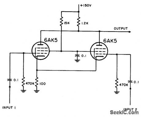Circuit is good adder for coincident inputs. Operates best with positive input pulses and negative going output.-NBS, Handbook Preferred Circuits Navy Aeronautical Electronic Equipment, Vol. 1, Electron Tube Circuits, 1963, p N4-7.