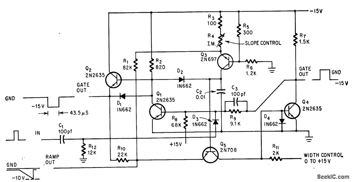 Transistorized version phantastron eliminates voltage pedestal by connecting C2 directly to ground. Slope is independent of gain of Q4 and is varied by R4 ove, range of 100 to 1. Duty cycle can be up to 98%. R4 is 1,000 ohms and width control voltage is 0.4 V for ramp output shown.-G. Marosi, Novel Sweep Circuit Eliminates Romp Pedestal, Electronics, 38:26, p 68.