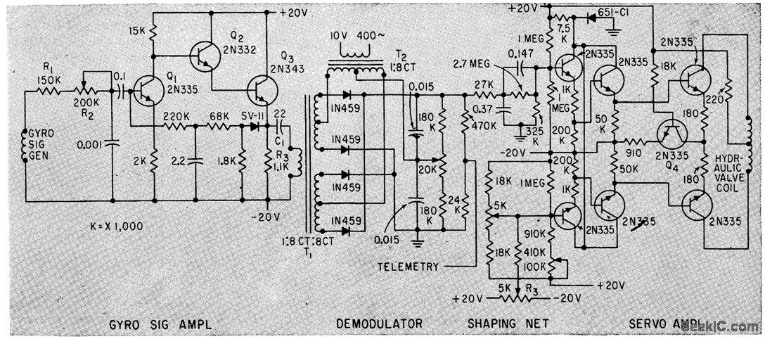 Identical channels amplify, demodulate, and shape gyro signal to feed direct-coupled differential servo amplifier whose output differential cur rent goes to dual-coil hydraulic control valve in rocket.-R. E. King and H. Low, Solid-State Guidance For Able-Series Rockets, Electronics, 33:5, p 60-63.