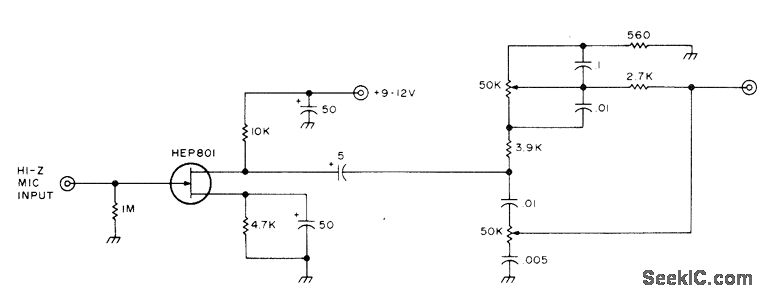 Improves effective signal strength of SSB transmitter by shaping AF frequency response ahead of audio compressor. Low-noise FET preamp providing initial gain for high-impedance microphone is followed by low- and high-rolloff circuit giving 15-dB boost or roll off to frequencies centered at about 1 kHz.-J. J. Schultz, Adding dBs to the Audio Compressor, 73 Magazine, May 1974, p 21-23 and 25.