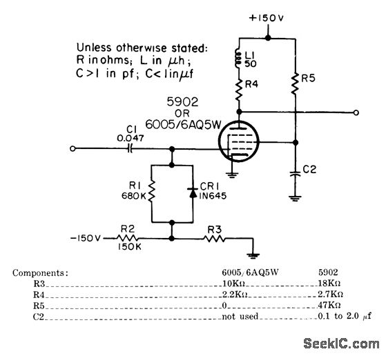 Used in search radars to amplify video signals to 60.v level required for intemsity modulation of cathode-ray indicator. Input polarity is positive. Amplification is 7.-NBS, Hand-book Preferred Circuits Navy Aeronautical Electronic Equipment, Vol. I, Electron Tube Circuits, 1963, PC 28, p 28-2.
