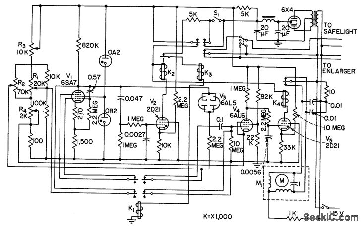 Uses radar phantastron circuit to give correct combination of exposure time and color filtier for desired contrast and density. R1 sets exposure time from 6 to 60 seconds and R2 regulates contrast.-J. D. Weir, Print Timer Controls Density and Contrast, Electronics, 31:7, p 108-109.