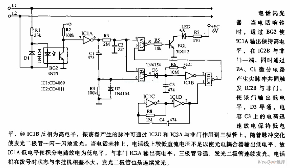 When the phone rings, the BG2 makes IC1A output high, and in one NAND gate end of IC2B, R4, C1 forms the differential circuit to generate spike pulse and trigger IC2B NAND gate, so that the gate outputs low, D3 is conduction , the charge on the capacitor C3 rapidly discharges and remains low, then it is in high level by IC1B inverter, and the oscillator pulse can be sent to the transistor by IC2D and IC2A NAND gates, and the LED flashes with the pulse changes. When the phone is not hung up, the DC voltage on telephone lines is not enough to make the optocoupler output low level.