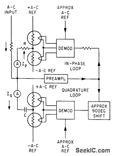 Two pairs of thermistor potentiometers balance the in-phase and quadrature components of input current, which are in phase and in quadrature with a-c reference of the same frequency, to permit displaying components simultaneously on two ac meters. Circuit and values for demodulators and preamplifier are same as for THERMISTOR CONTROL circuit.-I. C. Hutcheon, Using Thermistors as Servo Elements, Electronics, 34:5, p 52-55.